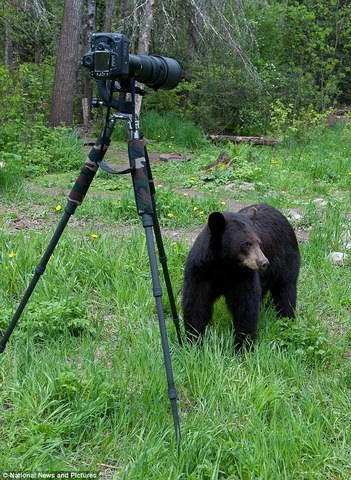 اما در کمال تعجب دید که خرس سیاه بجای تعقیب او به دوربین عکاسی اش نزدیک شد و کنجکاوانه در حال بررسی دوربین است.