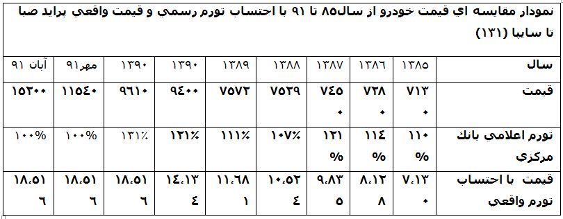 نكته قابل توجه كه بايد حتما به آن اشاره شود اين است كه طبق آمارهاي رسمي منتشر شده توسط بانك مركزي ايران شاخص كالاهاي مصرفي و شاخص بهاي خودرو در سال 1376 هر كدام 100 بوده اند و اين شاخص در سال 1390 در بخش كالاهاي مصرفي 760 يعني رشد 660 درصدي و بهاي خودرو 144 يعني رشد 44 درصدي يعني خودرو در مقايسه با كالاهاي ديگر از رشد طبيعي و عادي برخوردار نشده است.
