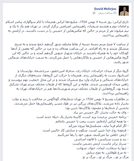 شاید درمیان طیف های گوناگون مخالفان انقلاب اسلامی و دشمنان نظام مقدس جمهوری اسلامی ایران بی منطق ترین گروه، همان گروه موسوم به "سلطنت طلب ها" و طرفداران رژیم شاهنشاهی پهلوی باشند که به لحاظ دانش و سواد سیاسی-تاریخی نیز در سطحی نازل قرار دارند. با این همه به تازگی، "محمّد مهرجو ملقب با داوید(مدیر مالی و اداری حزب رستاخیز که از احزاب و گروه های سلطنت طلب مخالف نظام جمهوری اسلامی است) با بازنشر مطلبی از صفحۀ فسیبوک"تاریخ ایرانی" در صفحۀ شخصی فیسبوکش درخصوص پیروزی انقلاب اسلامی در بهمن1357، ضمن اعتراف بر هر دو بعد انکارناپذیر انقلاب اسلامی یعنی "مردمی بودن" و "شکوهمندی" که غالباً ازسوی مخالفان نیز تایید شده، حتی بر بعد "اسلامی بودن" این حرکت مردمی که معمولاً ازسوی مخالفان نظام و دشمنان کتمان می گردد نیز مهر تایید زده و بر حقیقت آن صحه گذاشته است.