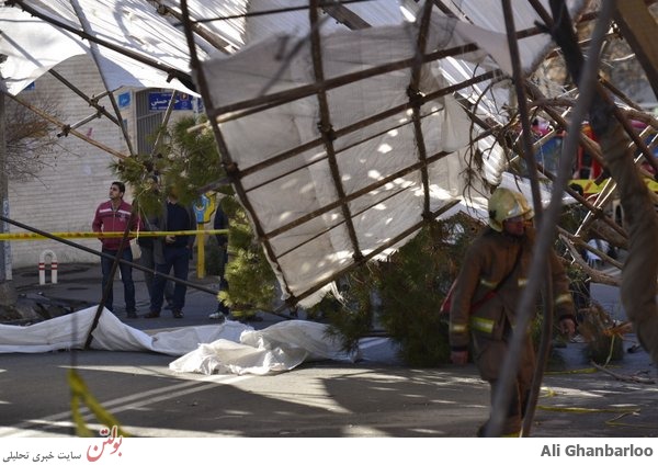 جدا شدن داربستهای فلزی ساختمانهای اطراف پل سید خندان تهران بر اثر باد شدید سحرگاهی
