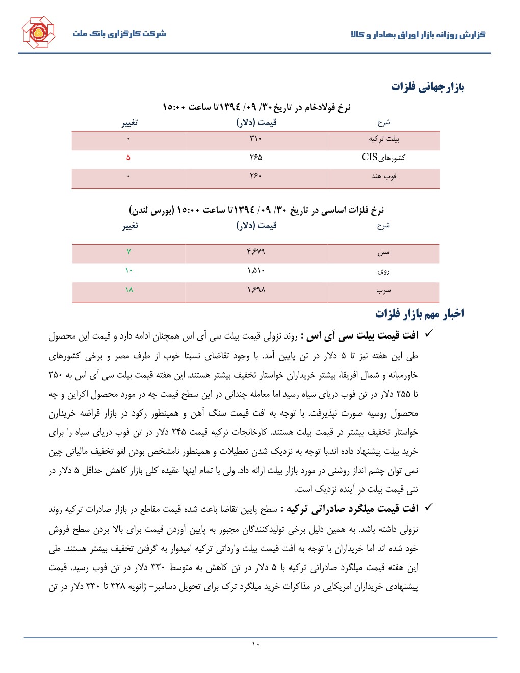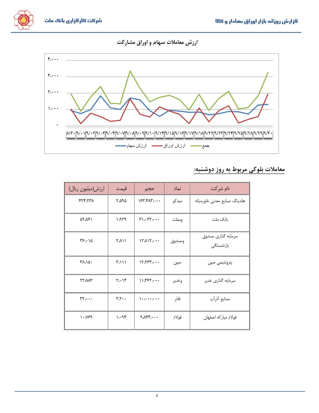 گروه بورس: شرکت کارگزاری بانک ملت، از کارگزاران رتبه «الف» بورس اوراق بهادار، در پایان هر روز گزارشی جامع و تحلیلی از روند معاملات بورس اوراق بهادار، بورس کالا و انرژی را برای آگاهی بیشتر فعالان بازار سرمایه تهیه می کند که از این پس این گزارش ها در پایگاه خبری بولتن نیوز قرار خواهد گرفت.