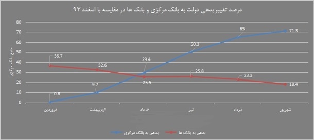 در سه ماهه اول سال جاری میزان بدهی دولت به بانک مرکزی 34.6 درصد و در سه ماهه دوم سال جاری 43.7 درصد افزایش یافته است. این در حالی است که بدهی سه ماهه اول سال 93 معادل 20.7 درصد افزایش یافته بود و بدهی سه ماهه دوم سال 93 معادل 2.7 درصد کاهش یافته بود. یعنی بر خلاف افزایش بدهی سال 94 در دوره مشابه سال قبل، رقم این بدهی کاهش هم یافته بود.