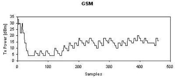 در مقاله ای که به بررسی الگوریتم کنترل توان خروجی تلفن های همراه تحت شبکه GSM پرداخته، می بینیم در این شبکه ابتدا حداکثر توان موبایل به کار گرفته می شود، اما پس از چند ثانیه الگوریتم کنترلی اقدام به کاهش آن (تا جای ممکن) می نماید: