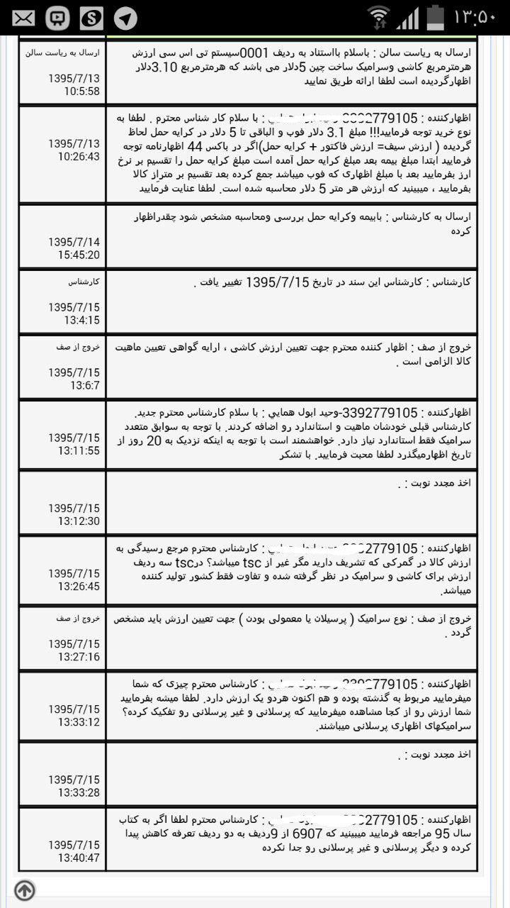 در پایان گوشهای از تبادلنظر صاحبان کالا با کارشناسان مجازی در سامانه گمرکی که تقریباً مؤدبانه بوده و قابلچاپ است برای اثبات ادعای فوق تقدیم رئیسکل محترم گمرک و خوانندگان عزیز میگردد.