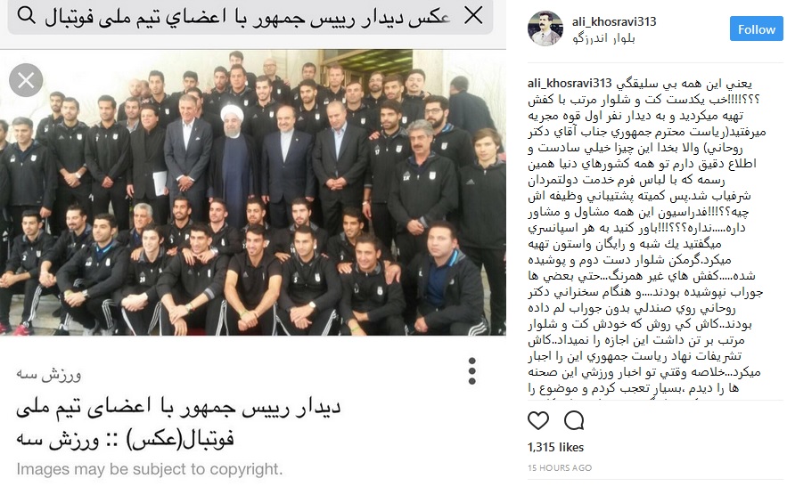 يعني اين همه بي سليقگي؟! خب يكدست كت و شلوار مرتب با كفش تهيه ميكرديد و به ديدار نفر اول قوه مجريه ميرفتيد (رياست محترم جمهوري جناب آقاي دكتر روحاني) والا بخدا اين چيزا خيلي سادست و اطلاع دقيق دارم تو همه كشورهاي دنيا همين رسمه كه با لباس فرم خدمت دولتمردان شرفياب شد.پس كميته پشتيباني وظيفه اش چيه؟! فدراسيون اين همه مشاول و مشاور داره.....نداره؟! باور كنيد به هر اسپانسري ميگفتيد يك شبه و رايگان واستون تهيه ميكرد.گرمكن شلوار دست دوم و پوشيده شده.....كفش هاي غير همرنگ...حتي بعضي ها جوراب نپوشيده بودند....و هنگام سخنراني دكتر روحاني روي صندلي بدون جوراب لم داده بودند..كاش كي روش كه خودش كت و شلوار مرتب بر تن داشت اين اجازه را نميداد..كاش تشريفات نهاد رياست جمهوري اين را اجبار ميكرد...خلاصه وقتي تو اخبار ورزشي اين صحنه ها را ديدم ،بسيار تعجب كردم و موضوع را منتشر كرده تا بگوش مسولين هاي كلاس فوتبالي و غير فوتبالي رسيده تا ديگر اين صحنه هاي عجيب را شاهد نباشيم.