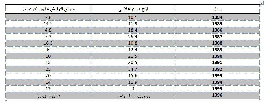 جدول زیر نشاندهنده میزان افزایش حقوق کارمندان در هرسال و نرخ تورم در همان سال است . همانطور که از اعداد جدول مشخص است در بسیاری از سالها میزان افزایش نرخ تورم بیش از رشد حقوق کارمندان دولت بوده است . در هفت سال از سالهای مذکور نرخ تورم بیش از نرخ حداقل دستمزد افزایش یافته است.
