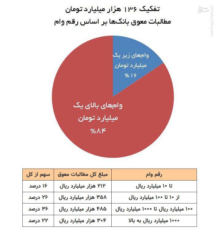 اما نکته مهمتر آن است که ۸۴ درصد مطالبات معوق بانکها مربوط به وامهای کلان (وامهای بیش از یک میلیارد تومان) است. طبق این گزارش، فقط ۱۶ درصد از کل مطالبات معوق بانکها مربوط به وامهای زیر یک میلیارد تومان است.