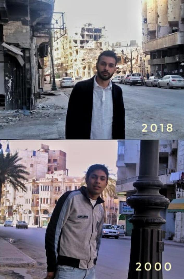 لیبی است در دو قاب عکس و فاصله زمانی 18 سال و این جوان همان جوان لیبایی است که امروز پشت به ویرانه های شهری روزی آباد، عکس می گیرد