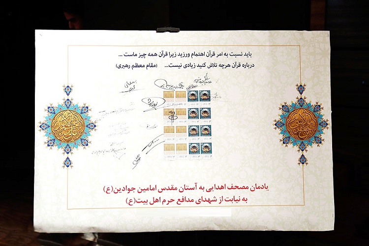 در پایان مراسم نیز با حضور رئیس بنیاد بینالمللی نهجالبلاغه، رئیس حوزه هنری سازمان تبلیغات اسلامی، نماینده عتبه مقدسه کاظمین(ع) و نماینده سپاه پاسداران، تمبر اختصاصی این مصحف شریف امضا شد.