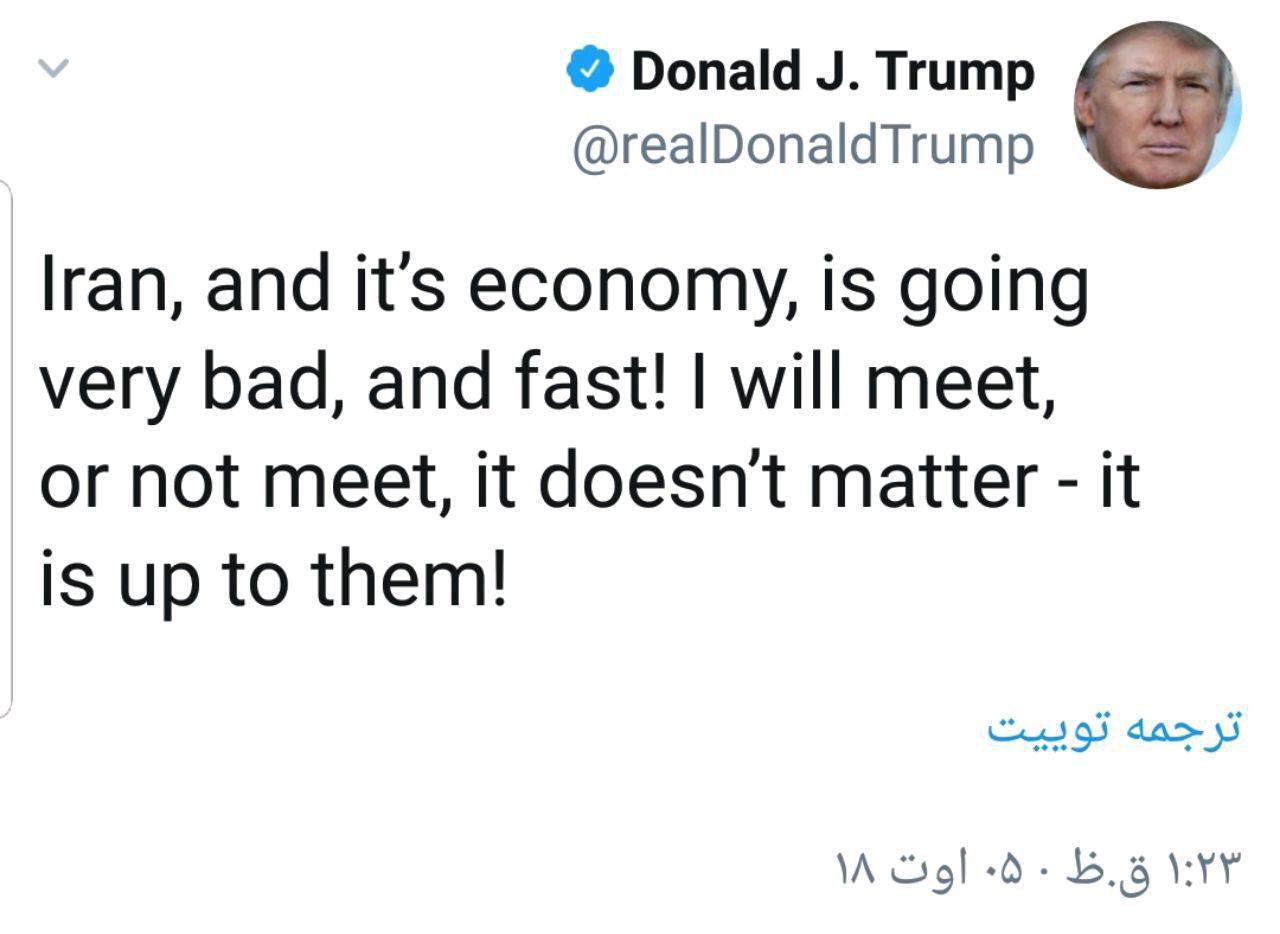 به گزارش تجارتنیوز، وی در توییتر نوشت: ایران و اقتصادش، خیلی سریع وضعیت بسیار بدی پیدا کرده! ملاقات کنیم، یا نکنیم، مهم نیست. به آنها بستگی دارد.