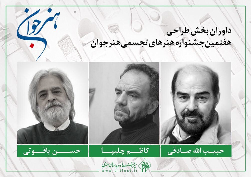 به گزارش بولتن نیوز، سید حمید شریفی دبیر هنری هفتمین جشنواره "هنر جوان" داوران این رویداد تجسمی را منصوب کرد. حبیب الله صادقی، کاظم چلیپا و حسن یاقوتی داوری بخش طراحی این رویداد حوزه تجسمی را برعهده گرفتند.