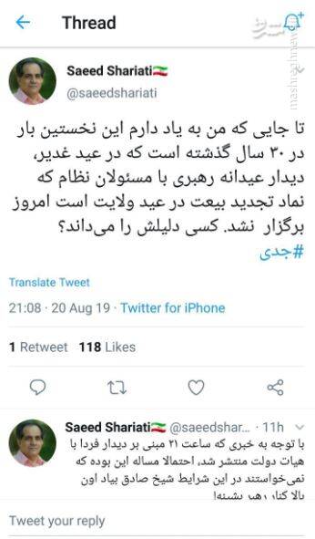گروه سیاسی: روز گذشته سعید شریعتی فعال اصلاحطلب و محکوم فتنه ۸۸، در صفحه توییترش نوشت: "تا جایی که من به یاد دارم این نخستین بار در ۳۰ سال گذشته است که در عید غدیر، دیدار عیدانه رهبری با مسئولان نظام که نماد تجدید بیعت در عید ولایت است امروز برگزار نشد. کسی دلیلش را میداند؟ "