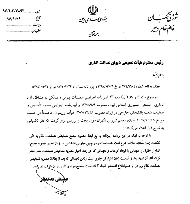در اواخر سال 1396 شاکی، نسبت به غیرشرعی بودن ماده 4 و بند ب ماده 13 آییننامه اجرایی عملیات پولی و بانکی در مناطق آزاد تجاری- صنعتی جمهوری اسلامی ایران مصوب 9/9/1378 و نیز آییننامه اجرایی محوه تأسیس و عملیات شعب بانکهای خارجی در ایران مصوب 28/12/1387 هیئتوزیران، دادخواستی را به هیئت عمومی دیوان عدالت اداری ارسال میدارد. ریاست دیوان متن دادخواست را طی نامه شماره 6604/282 مورخ 6/3/1397 در راستای تکالیف قانونی به فقهای معظم شورای نگهبان ارسال میدارد. فقهای شورای نگهبان نیز طی مکاتبه شماره 6615/102/97 مورخ 22/5/1397 و نیز متمم آن طی مکاتبه شماره 7893/102/97 مورخ 24/9/1397 مبنی برخلاف شرع بودن آن اعلام میگردد، اما بااینحال باگذشت نزدیک به یک سال هنوز پرونده ابطال شرعی در هیئت عمومی دیوان عدالت اداری طرح نشده است.