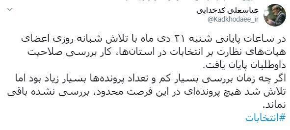 گروه سیاسی: دکتر عباسعلی کدخدایی سخنگوی شورای نگهبان، در حساب توییتری خود نوشت: در ساعات پایانی شنبه ۲۱ دی ماه با تلاش شبانه روزی اعضای هیاتهای نظارت بر انتخابات در استانها، کار بررسی صلاحیت داوطلبان پایان یافت.