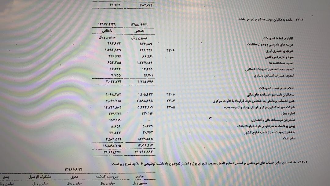 الف: صورتهای مالی شش ماهه سال 1398 بانک ملت دارای ردیفی تحت عنوان بدهکاران بابت سوء استفاده های مالی است که رقمی معادل 120 میلیارد تومان را بابت مانده وجوه سرقتی و اختلاسی از بانک ملت نشان می دهد که فقط مبلغ 1.6 میلیارد تومان از آن وصل شده است.