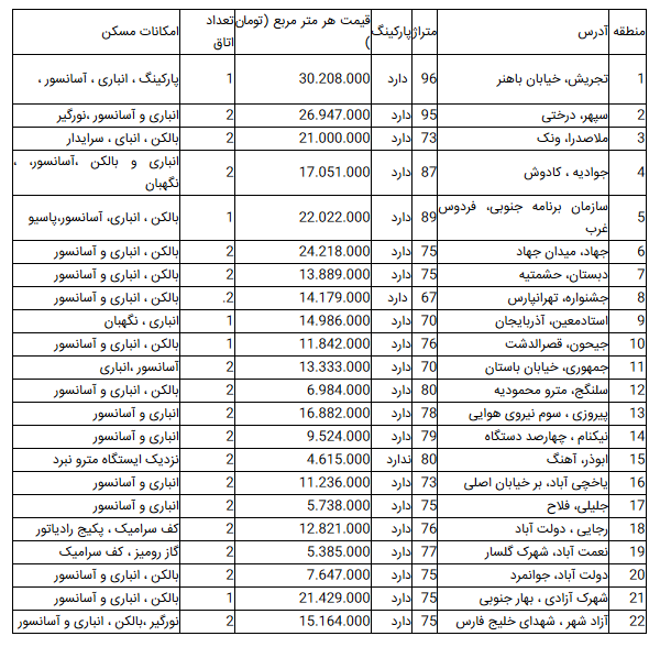 لیست قیمت واحد مسکونی در مناطق مختلف تهران به شرح زیر است:
