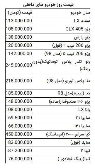 قیمت خودرو های داخلی بر اساس نرخ اعلام شده از سوی اتحادیه صنف دارندگان نمایشگاه و فروشندگان خودرو تهران است.