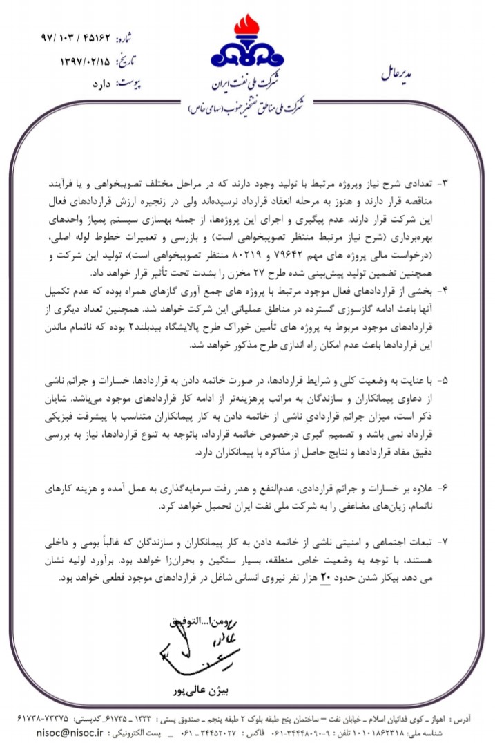 همچنین بیژن عالیپور مدیرعامل وقت شرکت ملی مناطق نفتخیز جنوب در نامه دیگری به کریم زبیدی مدیر برنامهریزی تلفیقی شرکت ملی نفت ایران در تاریخ 15 اردیبهشت ماه 97 به صورت مفصل تبعات منفی ترخیص دکلهای حفاری و توقف قراردادهای فعال تشریح می کند که یکی از آنها تبعات امنیتی و اجتماعی ناشی از بیکاری 20 هزار پرسنل فعال در قراردادهای موجود است. تصویر این نامه به شرح زیر است: