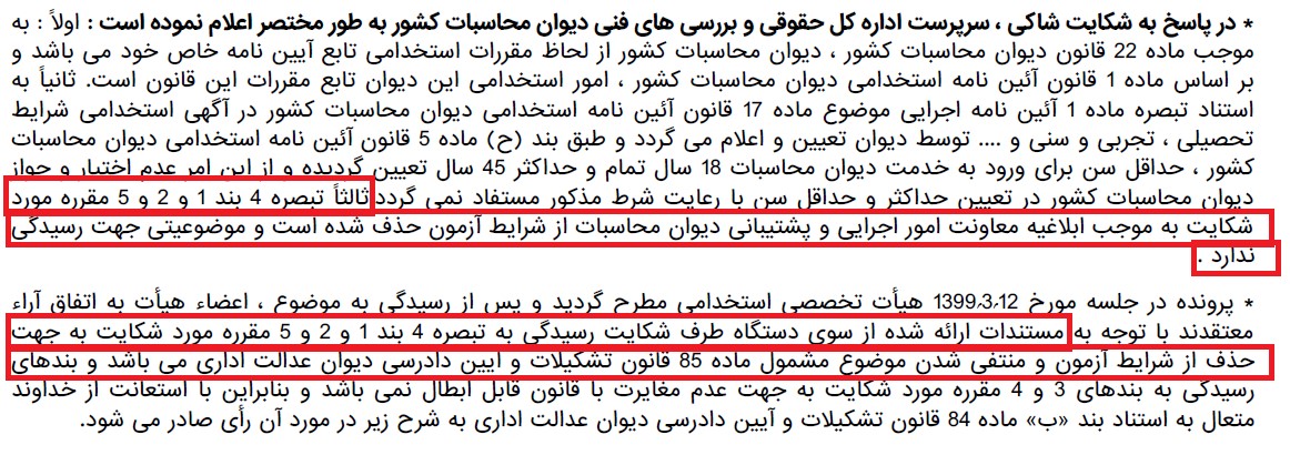 بر اساس شکایتی که از این آزمون به دیوان عدالت اداری شده بود، ابطال بندهایی از آن به عنوان خواسته به دیوان عدالت اداری تقدیم شد و طی تبادل لوایح، دیوان محاسبات کشور عنوان داشت: