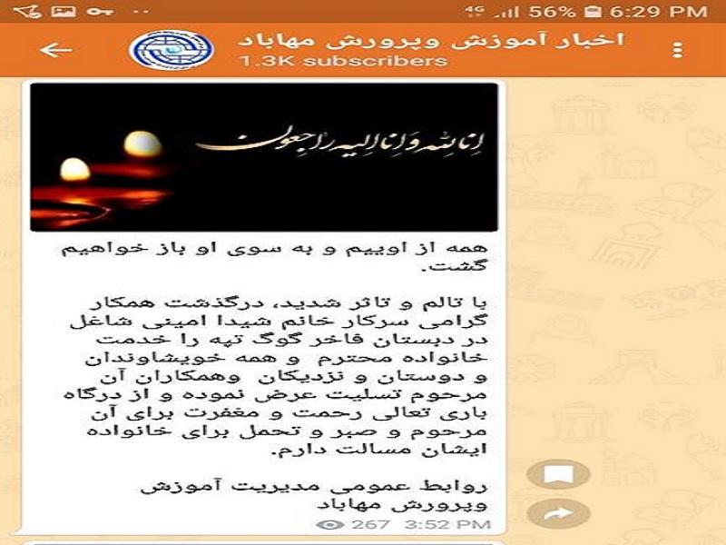 گروه اجتماعی: خانم شیدا امینی آموزگار مهابادی، شب آخر و ساعاتی قبل از فوتش، وارد سامانه "شاد" شد و با یکایک دانش آموزانش خداحافظی نمود و برای آنها آرزوی سلامتی کرد.