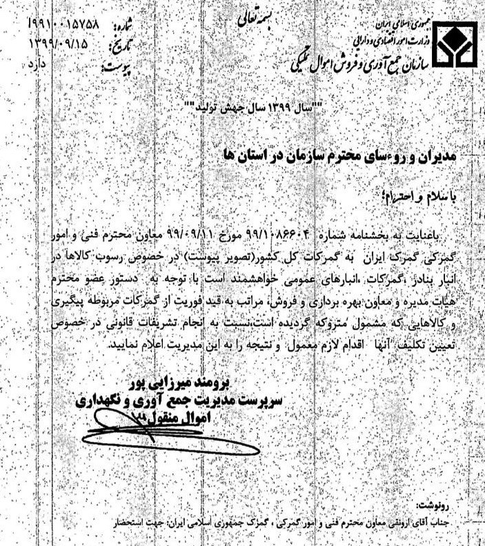 گروه اقتصادی: سرپرست جمع آوری و مدیریت اموال منقول سازمان جمع آوری و فروش اموال تملیکی کشور در بخشنامه ای به مدیران و روسای سازمان در سراسر کشور اعلام کرد، بر اساس بخشنامه گمرک ایران در خصوص رسوب کالاها در انبار 1-بنادر، 2-گمرکات، 3-انبارهای عمومی مراتب به قید فوریت از گمرکات پیگیری شده و کالاهایی که مشمول متروکه گردیده است نسبت به انجام تشریفات قانونی در خصوص تعیین تکلیف آنها اقدام شود.