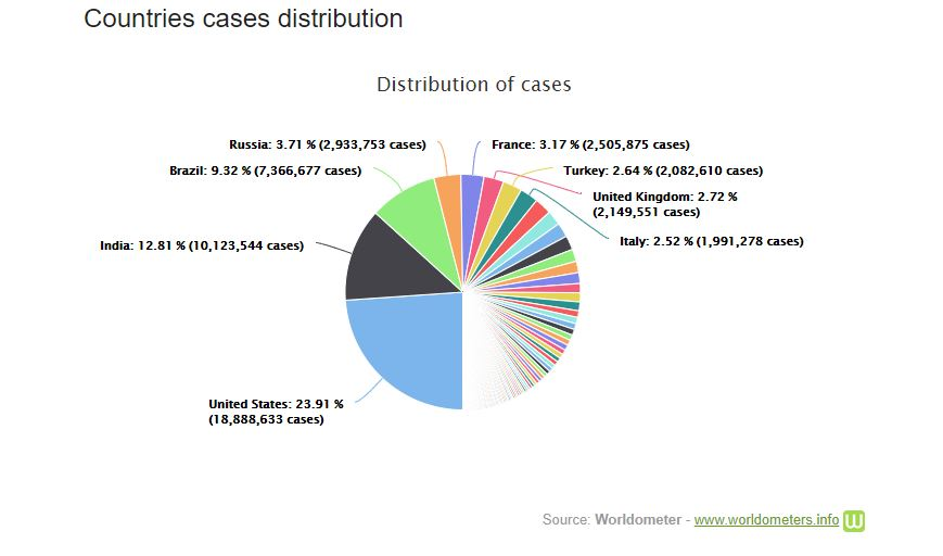 بررسیهای آماری نشان میدهد که آمریکا ۲۳.۹۳ درصد از کل مبتلایان به این بیماری را در خود جای داده است. بعد از آن، هند با حدود ۱۲.۸۱ درصد از کل مبتلایان جهان یعنی تقریبا ده میلیون و صد هزار نفر در رتبه دوم قرار دارد. بعد از آنها برزیل با هفت میلیون و سیصد و شصت هزار مبتلا یعنی ۹،۳۲ درصد کل بیماران، قرار دارد.