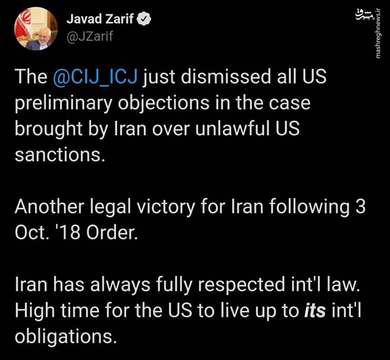 محمد جواد ظریف، وزیر امور خارجه در واکنش به رد شدن قاطعانه اعتراضات آمریکا توسط دیوان لاهه طی توییتی نوشت...