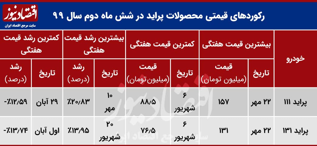 اما پایین ترین رشد قیمت هفتگی برای پراید 131 در اول آبان ماه ثبت شده است، این خودرو در این روز افت قیمت 13.7 درصدی را به خود اختصاص داد و بالاترین رشد قیمت نیز 14 درصد بوده که در روز 20 شهریور رقم خورد. در نیمه دوم سال 99 پراید 131 بیشترین نوسان قیمت را تجربه کرد، بطوریکه پس از عبور قیمت این خودرو از مرز 100 میلیون تومان این خودرو برای مدت کوتاهی قیمت زیر 100 میلیون بازگشت، اما این روند چندان دوام نیاورد و قیمت این خودرو مجدد به بالای 100 میلیون بازگشت.