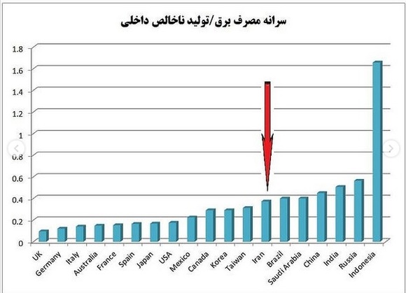 اگر سرانه مصرف برق هر فرد را به سرانه تولید ناخالص داخلی تقسیم کنیم، جایگاه ایران از نظر پرمصرف بودن به جایگاه ششم صعود میکند و دیگر رتبه ۱۶ بزرگترین مصرفکننده برق جهان، بیانگر واقعیت مصرف برق نیست. روسیه، چین، هند، عربستان سعودی و برزیل از این نظر پرمصرفتر از ایران هستند. به عبارتی، بهرهوری مصرف برق در این کشورها از ایران هم وضعیت بدتری دارد.