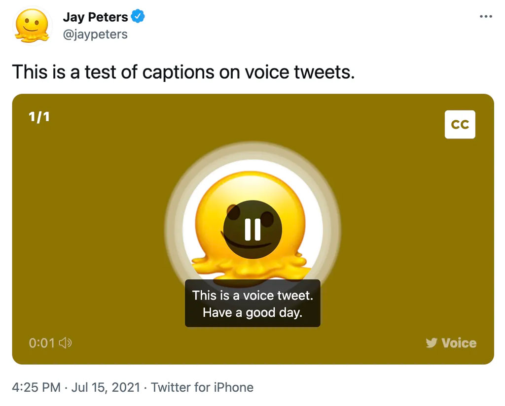 به گزارش بولتن نیوز به نقل از دیجیاتو، نبود زیرنویس برای توییتهای صوتی موجب میشود تا کاربرانی که دچار مشکلات مرتبط با شنوایی هستند، نتوانند از محتوای ارائه شده بهره ببرند. اکنون هنگامی که کاربران اقدام به ایجاد توییتهای صوتی میکنند، زیرنویس آنها نیز به صورت خودکار برای زبانهای پشتیبانی شده، ایجاد میشود. درحال حاضر زبانهای انگلیسی، ژاپنی، اسپانیایی، پرتغالی، ترکی، عربی، هندی، فرانسوی، اندونزیایی، کرهای و ایتالیایی توسط توییتر پشتیبانی میشوند. البته ارسال توییتهای صوتی هنوز محدود به سیستمعامل iOS است و کاربران سایر پلتفرمها از جمله اندروید نمیتوانند از آن استفاده کنند.