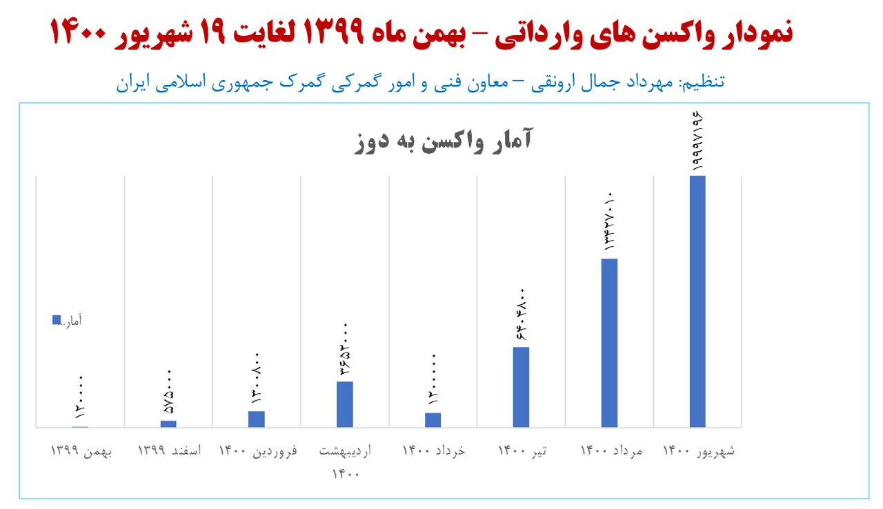 براساس گزارش معاون فنی گمرک ایران ، تعداد واکسن های وارداتی در شهریور ماه بالاترین حد را نسبت به ماه های گذشته داشته است ؛ به طوری که از بهمن پارسال تا به امروز بیشترین میزان حدود ۱۹ میلیون و ۹۹۷ هزار و ۱۹۶ دوز در حدود ۱۹ روز گذشته از شهریور ماه وارد کشور شده است.