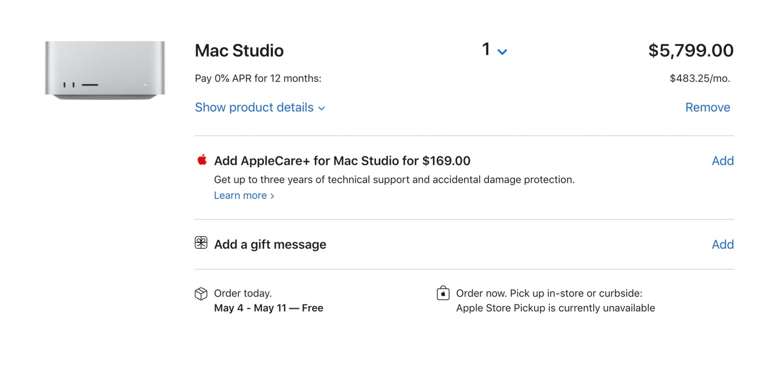 به گزارش بولتن نیوز به نقل از دیجیاتو، در حال حاضر اگر کسی به سایت اپل برود و بخواهد مک استودیو با 128 گیگابایت حافظه رم یکپارچه را خریداری کند، زمان تحویل 25 ماه مه (4 خرداد) اعلام میشود. با این حال، مدل 64 گیگابایتی تا پیش از انتهای ماه آوریل به دست خریداران میرسد. هماکنون سریعترین زمان تحویل سفارش برای مک استودیو با 64 گیگابایت رم و 64 هسته گرافیکی 30 مارس (10 فروردین) اعلام شده است.