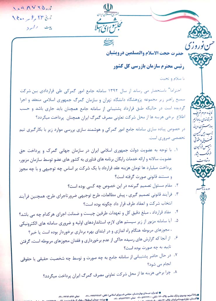 حسن نوروزی نایب رئیس کمیسیون قضایی و حقوقی مجلس در تاریخ ۲۳ شهریور ۱۴۰۰ در نامهای به حجتالاسلام درویشیان رییس سازمان بازرسی کل کشور، در مورد عملکرد شرکت سمیع راهبر نوشت: از سال ۱۳۹۲ سامانه جامع امور گمرکی، قراردادی بین شرکت سمیع راهبر زیرمجموعه پژوهشگاه دانشگاه تهران و سازمان گمرک منعقد و اجرا شده است در حالی که طبق قرارداد، پشتیبانی از سامانه جامع همچنان باید جاری باشد و حسب اطلاع برخی هزینهها از محل شرکت تعاونی مصرف گمرک ایران همچنان پرداخت میشود. در خصوص پیاده سازی سامانه جامع امور گمرکی و هوشمندسازی بررسی موارد زیر با به کارگیری تیم تخصصی ضروری است: