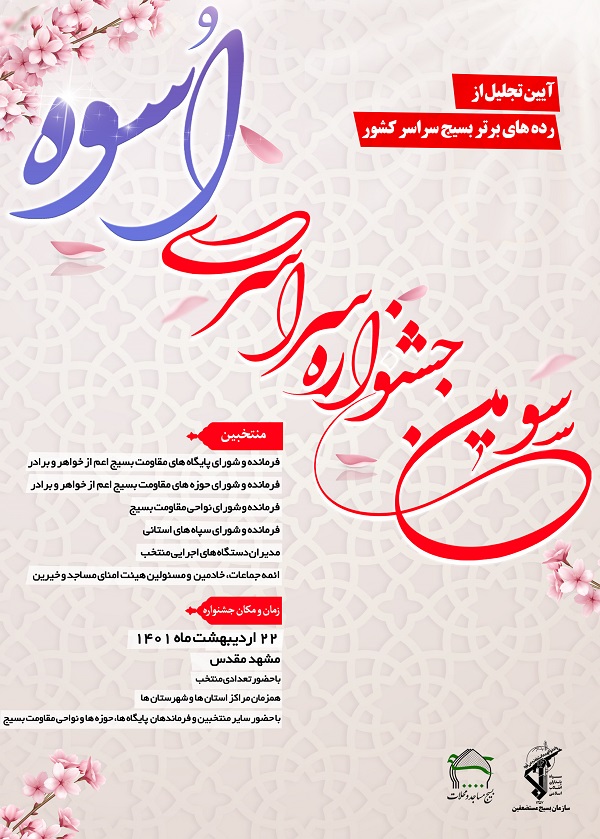 به گزارش بولتن نیوز، سومین جشنواره سراسری اسوه آئین تجلیل از رده های برتر بسیج سراسر کشور روز 22 اردیبهشت ماه با حضور تعدادی از منتخب برگزار می شود.