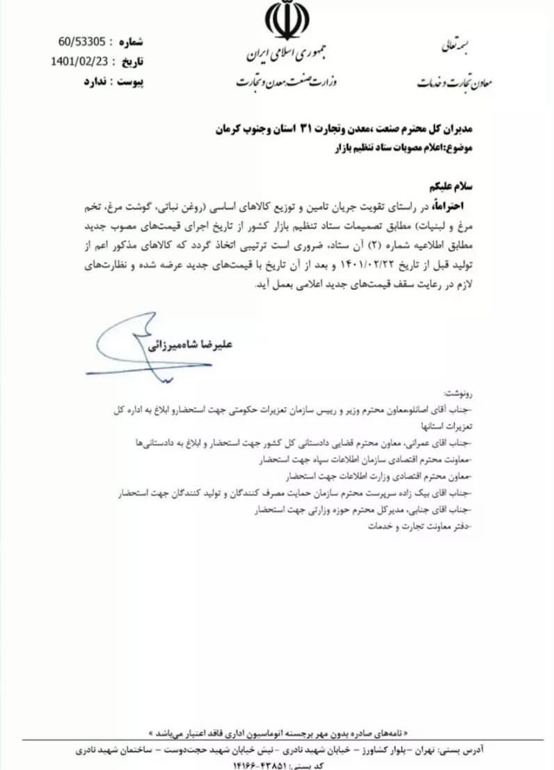 به گزارش بولتن نیوز، در واکنش به افزایش دستوری قیمت روغن نباتی، گوشت مرغ، تخم مرغ و لبنیات که طی بخشنامه ای از سوی معاون تجارت و خدمات وزارت صنعت معدن و تجارت به مدیران کل صنعت و معدن و تجارت 31 استان و جنوب کرمان در آن مصوبه ستاد تنظیم بازار به واحدهای تولید ابلاغ شده، دستور داده شده که در راستای تقویت تامین توزیع کالاهای اساسی ( روغن نباتی، گوشت مرغ، تخم مرغ و لبنیات) از تاریخ اجرای قیمت های مصوب جدید ضروری است ترتیبی اتخلذ شود که کالاهای مذکور اعم از تولید قبل از تاریخ 22/02/1401 و بعد از آن تاریخ با قیمت های جدید عرضه شده و نظارت های لازم در رعایت سقف قیمت های جدید اعلامی به عمل آید.