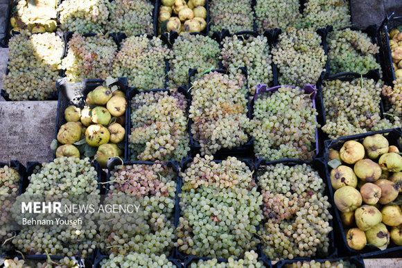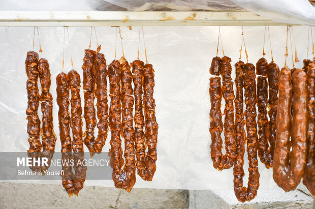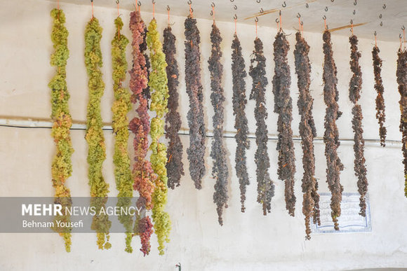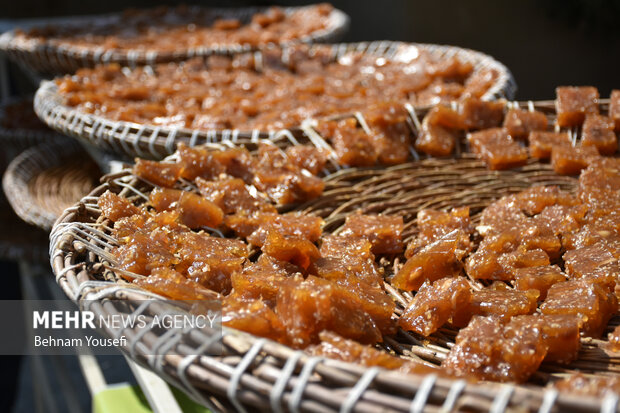 انواع محصولات تولید شده از انگور اعم از شیره، ترخنه، سرکه و فرآوردههای انگور و گردو و بادام عرضه شد.