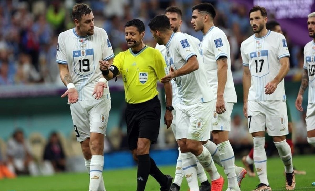 خوزه ماریا گیمنز، مدافع اروگوئه برابر برونو فرناندز، بازیکن پرتغال زمین خورد، توپ در حین انجام این کار به دست او برخورد کرد. دستورالعمل IFAB بیان میکند که این صحنه خطا نیست، اما عبدالله المری، مسئول سیستم کمک داور ویدیویی آن دیدار، به داور ایرانی، علیرضا فغانی دستور داد تا تصمیم را بررسی کند.