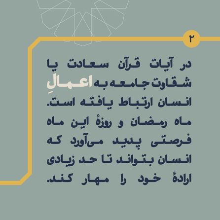 در آیات قرآن سعادت یا شقاوت جامعه به #اعمال انسان ارتباط یافته است. ماه رمضان و روزهی این ماه فرصتی پدید می آورد که انسان بتواند تا حد زیادی #ارادهی خود را مهار کند.