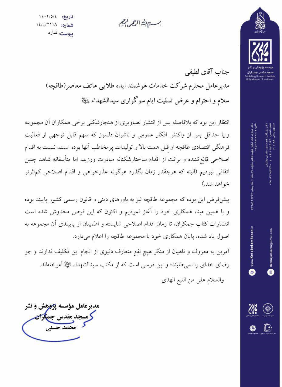 نظر به اینکه رعایت قوانین جمهوری اسلامی و پایبندی به احکام شرعی اسلام جزو بدیهیات همکاری «موسسه ایمان ماندگار» با هر طرف قراردادی است، لازم میدانیم مراتب اعتراض خود را به این اقدام هنجارشکنانه اعلام کرده و علیرغم همکاری مثبت این چند سال است در حوزه کتاب الکترونیک با آن شرکت، خواهان فسخ قرارداد فی مابین بوده و از این تاریخ عدم همکاری خود با آن شرکت را اعلام میداریم.