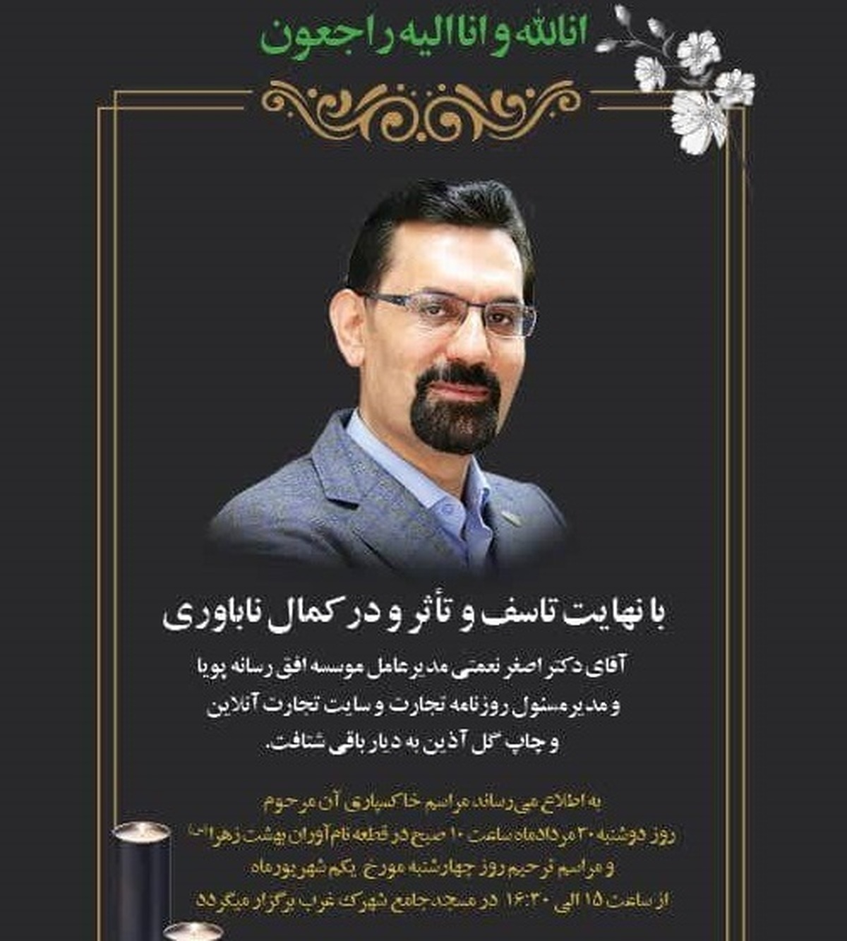 دکتر اصغر نعمتی، مدیرعامل موسسه افق رسانه پویا و مدیر مسئول روزنامه تجارت و سایت تجارت آنلاین به دیار باقی شتافت