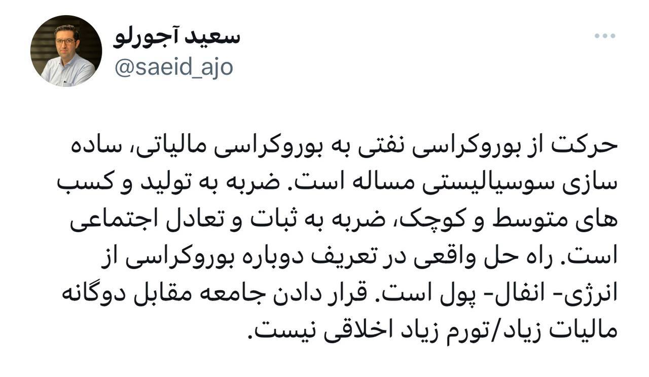 به گزارش بولتن نیوز به نقل از صبح نو، سعید آجورلو مدیرمسئول صبح نو در توییتر نوشت: «حرکت از بوروکراسی نفتی به بوروکراسی مالیاتی، ایده ای سوسیالیستی برای ساده سازی مساله است که به تولید متوسط و کوچک ضربه می زند و ثبات و تعادل اجتماعی را تحت تاثیر قرار می دهد.»