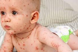 و پس از گذشت 1.2 روز بثورات پوستی ظاهر میشود. این پثورات عبارت از تاول ها ،جوش ها ،دانه ها سرخ رنگ ،قرمزی ناشی از قرمزی است.