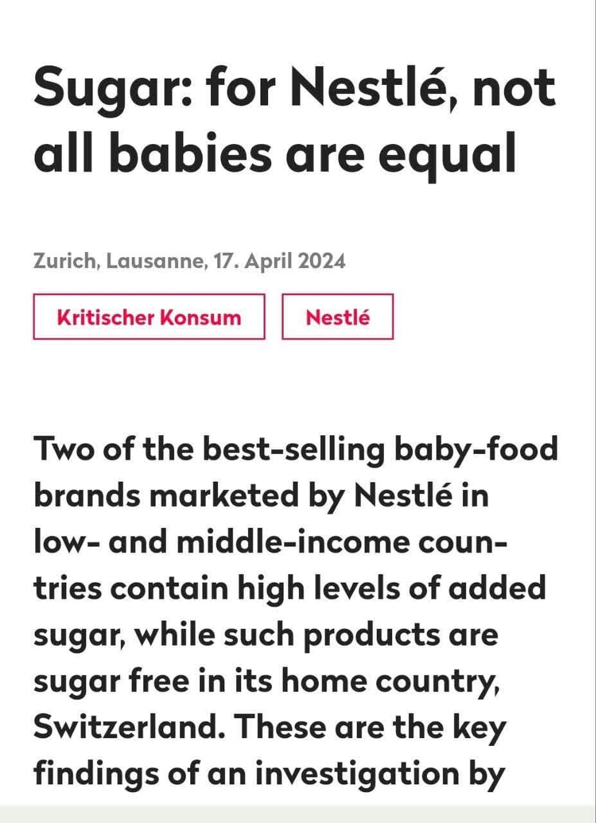 به گزارش بولتن نیوز به نقل از جهاد تبیین،  موسسه پابلیک آی در یک گزارش تحقیقی نشان داده غذای کودکی که شرکت نستله به کشورهای پیرامونی جهان می فروشد حاوی مقدار فراوان شکر است درحالی که همان غذا دربازار اروپا و امریکا فاقد شکر است.