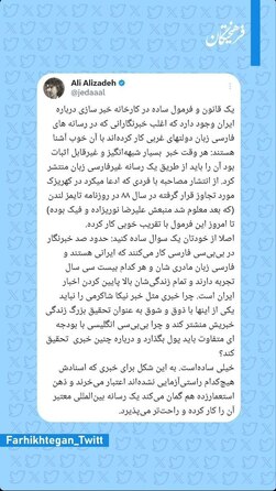 به گزارش بولتن نیوز به نقل از تسنیم، بیبیسی پس از انتقادهای گسترده به اسناد ادعایی که امروز درباره نیکا شاکرمی از جانباختگان فتنه ۱۴۰۱ منتشر کرده بود، ساعتی پیش در توئیتی نوشت که بیبیسی خودش این اسناد را «بازسازی» کرده است!