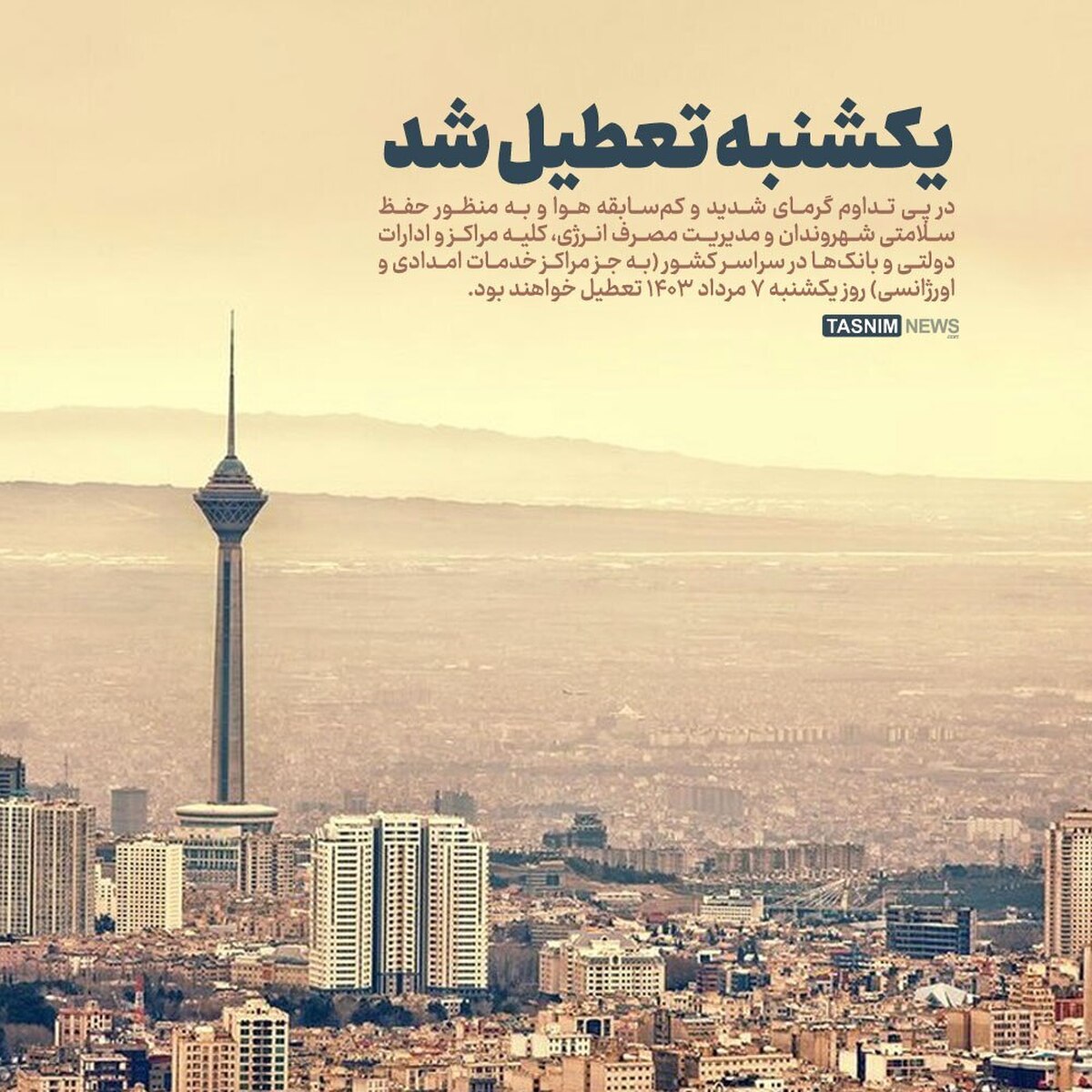 به گزارش بولتن نیوز به نقل از ایسنا، در پی تداوم گرمای شدید و کم‌سابقه هوا و به منظور حفظ سلامتی شهروندان و مدیریت مصرف انرژی، کلیه مراکز و ادارات دولتی و بانک‌ها در سراسر کشور (به جز مراکز خدمات امدادی و اورژانسی) روز یکشنبه ۷ مرداد ۱۴۰۳ تعطیل خواهند بود.