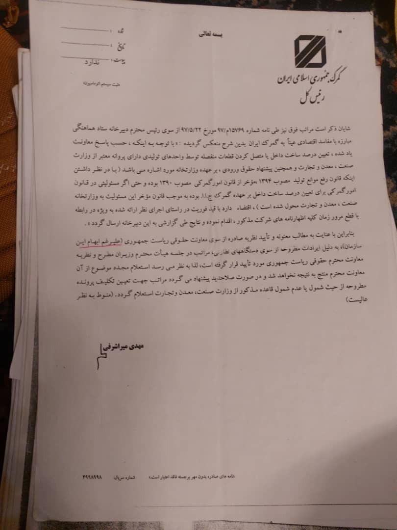 فشارها تنها به لابیهای پارلمانی محدود نماند. اسناد دیگر، از یک شکاف عمیقتر در درون خود دولت پرده برمیدارند. نامهای از سوی بالاترین مقام گمرک نشان میدهد که وزارت صنعت، معدن و تجارت (صمت)، به عنوان متولی تولید در کشور، دیدگاهی متفاوت نسبت به این پرونده داشته است. این اختلاف نظر، گمرک را که وظیفه قانونیاش وصول درآمدهای دولت است، در برابر وزارتخانهای قرار میداد که دغدغه اصلیاش حفظ چرخه تولید واحدهای صنعتی بزرگ است. این تقابل کلاسیک میان "تنظیمگر" و "تسهیلگر"، پرونده گلدیران را به میدانی برای جنگ ارادهها در بدنه اجرایی کشور تبدیل کرد.