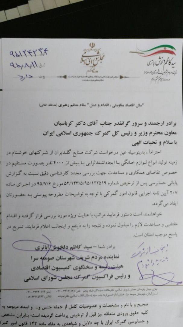 درست زمانی که به نظر میرسید پرونده مسیر قانونی خود را طی میکند، نامهای با سربرگ مجلس شورای اسلامی، معادلات را تغییر داد. سید کاظم دلخوش اباتری، نماینده مجلس و مهمتر از آن، "رئیس فراکسیون گمرک مجلس"، در نامهای مستقیم به رئیس وقت کل گمرک، دکتر کرباسیان، وارد عمل شد. او در این نامه، ضمن اشاره به "بیش از ۴۰۰۰ نفر" پرسنل شرکت گلدیران، خواستار "بررسی مجدد" و "تسریع در پاسخ" شد. این نامه، که لحنی دیپلماتیک اما پیامی روشن داشت، نشان میداد که پرونده از یک اختلاف حسابرسی صرف، به یک موضوع با ابعاد سیاسی تبدیل شده است. آیا نگرانی برای اشتغال ۴۰۰۰ کارگر، میتوانست یک پرونده مالی با این ابعاد را تحتالشعاع قرار دهد؟