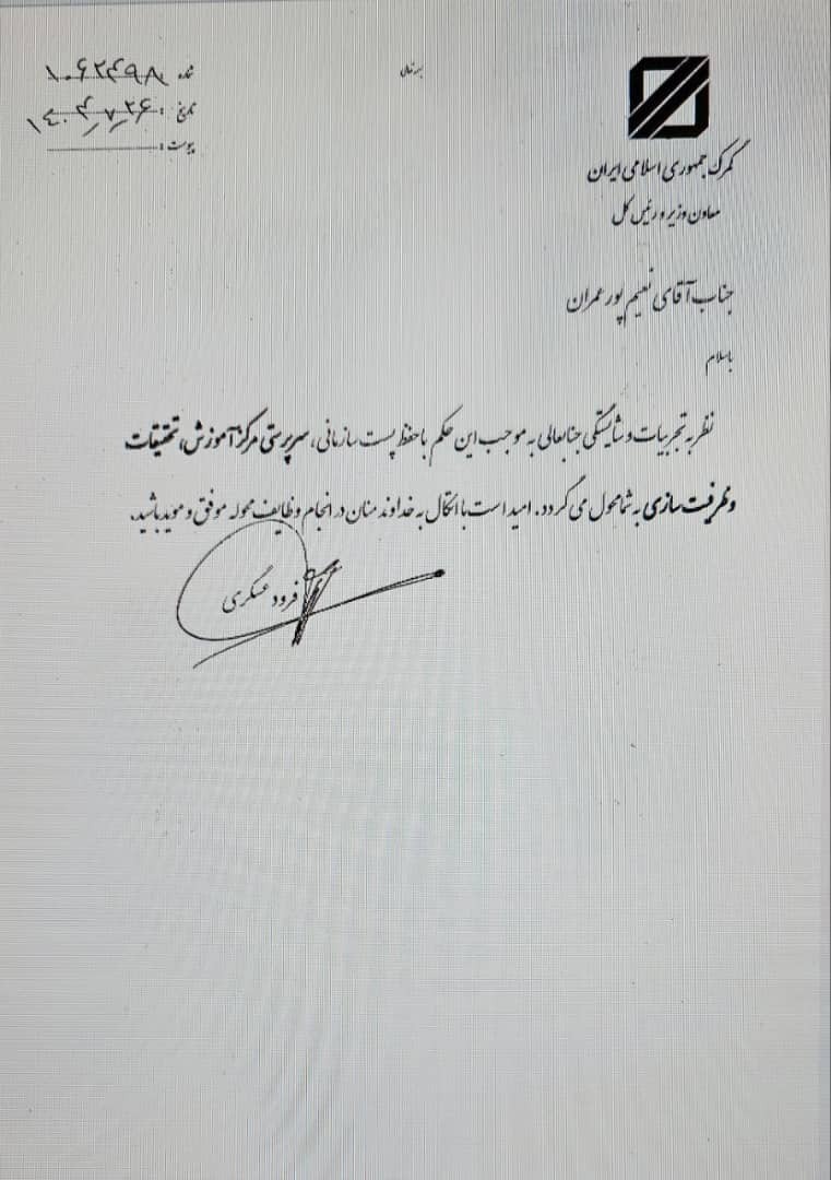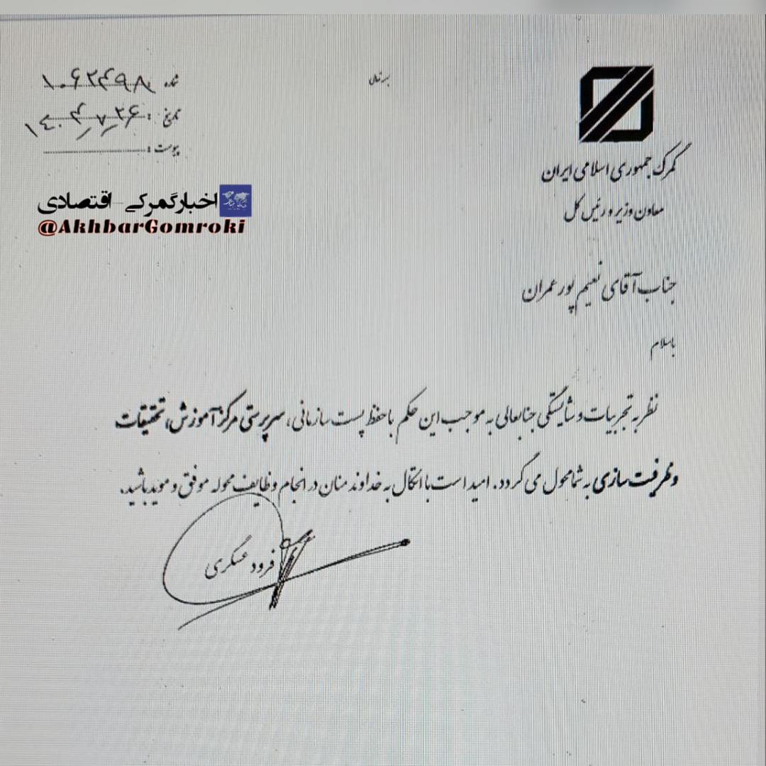 این گزارش می افزاید: در حکم دیگری از سوی رئیس کل گمرک ایران نعیم پورعمران به سمت سرپرستی مرکز آموزش، تحقیقات و ظرفیتسازی منصوب گردید. پورعمران پیش از این معاون مرکز آموزش، تحقیقات و ظرفیت سازی گمرک بود.