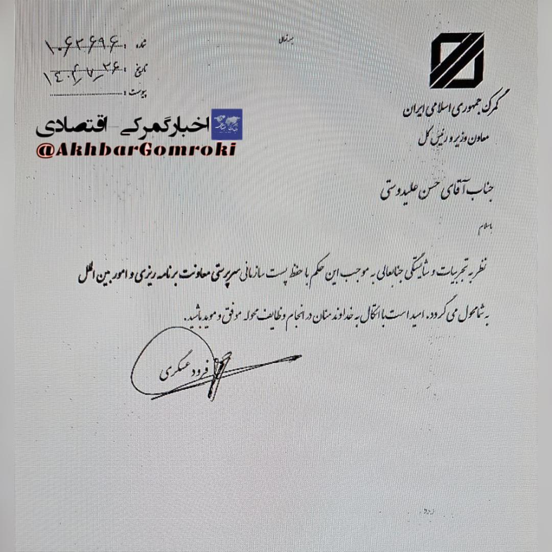 به گزارش بولتن نیوز به نقل از روابط عمومی گمرک ایران، بر اساس این احکام با حکم فرود عسگری معاون وزیر اقتصاد و رئیس کل گمرک ایران، حسن علیدوستی به سمت سرپرستی معاونت برنامهریزی و امور بینالملل گمرک منصوب شد. حسن علیدوستی از مدیران با سابقه گمرک در حوزه اجرایی و ستادی به شمار میرود. پیش از این ابوالفضل اکبرپور عهدهدار این سمت بود.