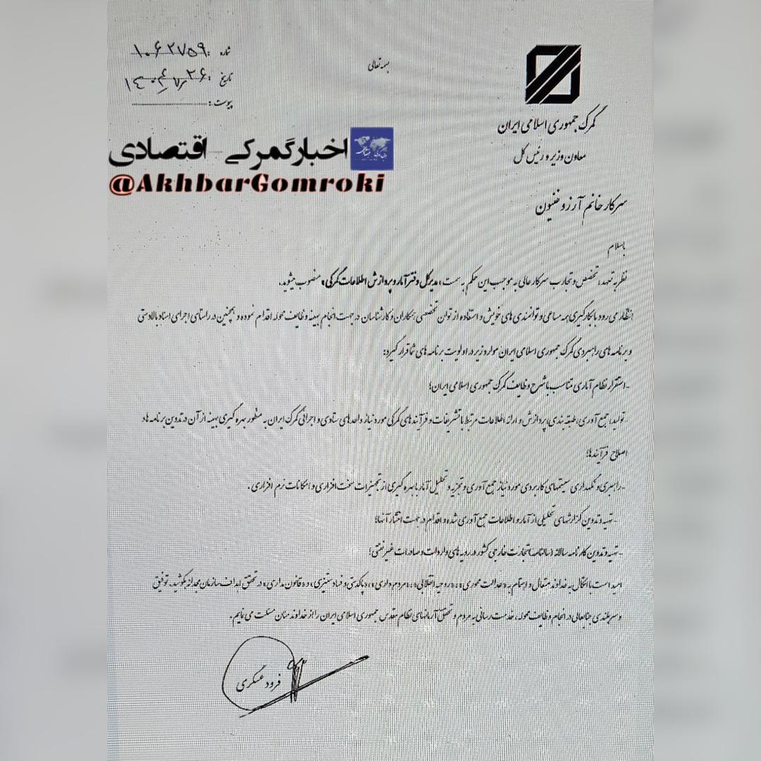 همچنین در حکم دیگری، آرزو غنیون به سمت مدیر کل دفتر آمار و پردازش اطلاعات گمرکی منصوب شد. غنیون پیش از این معاون دفتر آمار و پردازش اطلاعات گمرکی بود.